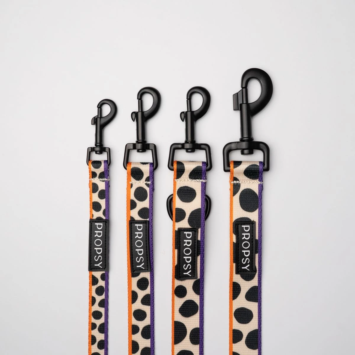 W naszych smyczach w standardowej ofercie stosujemy metalowe karabińczyki. Na zdjęciu poniżej porównanie wszystkich wielkości standardowych karabinków stosowanych w propsach. Od lewej do taśmy 1,5 cm, 2 cm, 2,5 cm mały, 2,5 cm duży.